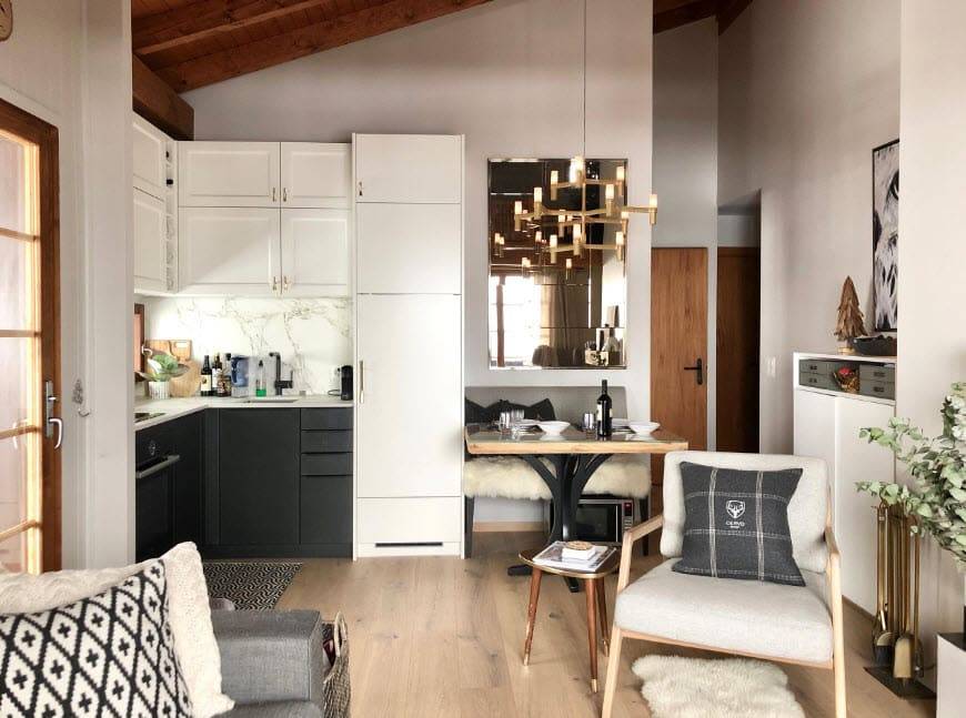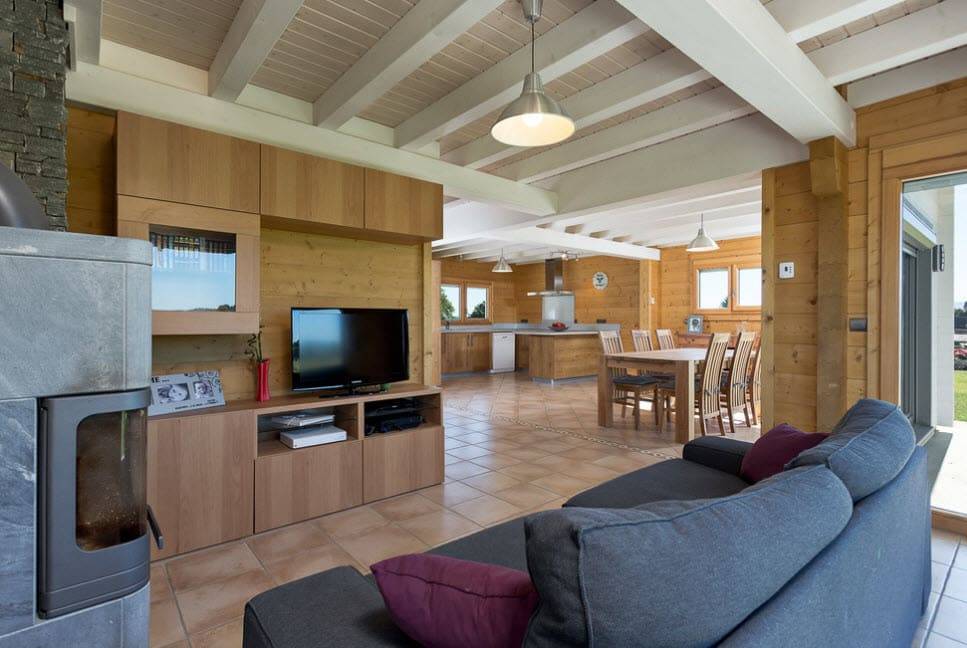 Интерьеры гостиных шале характеризуются функциональностью. Они обычно большие, просторные и светлые. Дом горца должен включать вместительную кухню (часто совмещенную со столовой, оборудованную большим столом из сырого дерева), уютную спальную и гостиную зону.