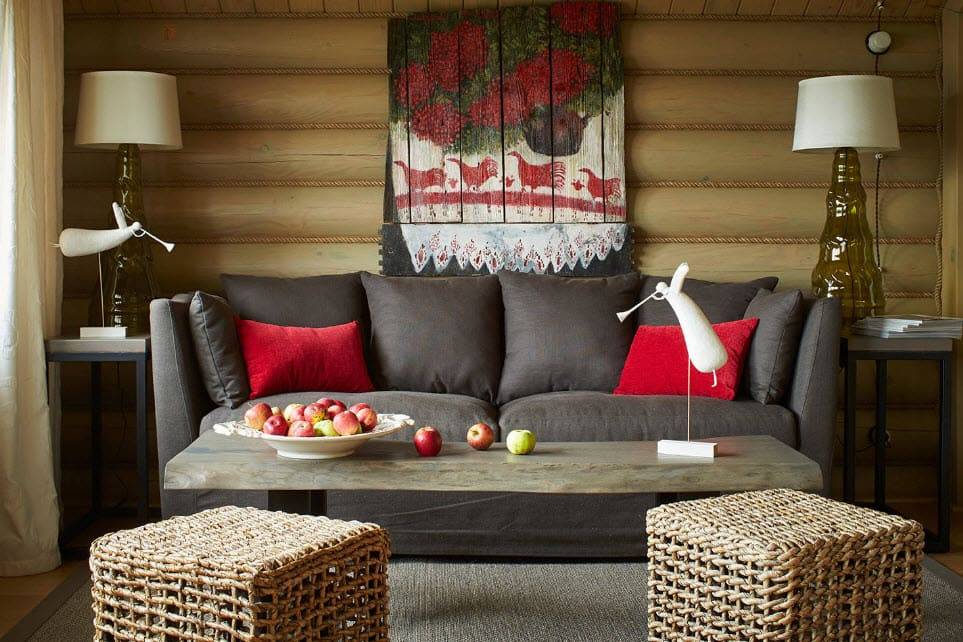 Говоря об аксессуарах, украшениях, без которых интерьер гостиной в стиле шале, судя по приведенным здесь фото, не может быть истинно деревенским, можно упомянуть звериные шкуры, ручной работы посуду из глины, вышитые салфетки и занавески, плетеные предметы (от мебели до ваз), кованые подсвечники. Все эти предметы могут быть созданы народными умельцами в духе одного из этнонаправлений. Ведь без хендмейда гостиная будет неживой, ненастоящей, будто пустующей.