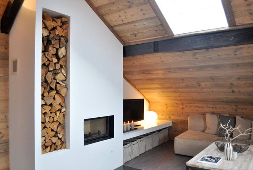 Рядом с камином обязательно оборудуется место для хранения дров – это может быть специальная ниша или поленница, которые также являются стильными элементами декора.