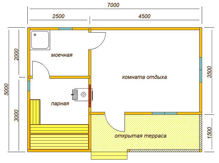 Если же хочется дополнительных удобств, в проект бани 3 на 4 м можно включить небольшую душевую комнату или помывочную. После парилки здесь можно будет смыть с себя грязь и освежиться. Для типовых проектов характерно наличие комнаты отдыха, которая будет эксплуатироваться в перерывах между сеансами пара. Для ее организации потребуется 4,5 м².