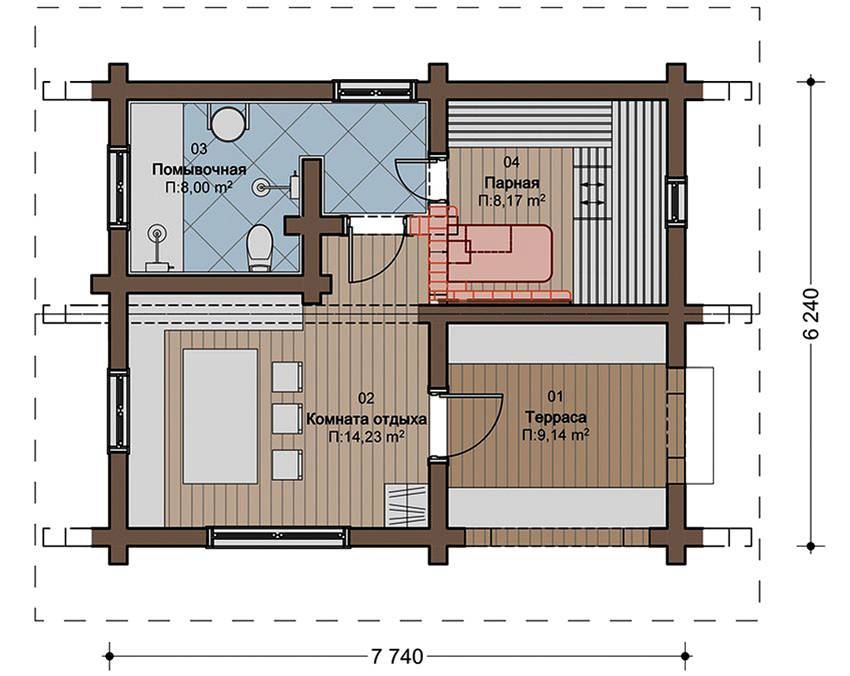 Это может быть одна или две спальни с комнатой отдыха, а может быть просто большой холл с диваном для сна и отдыха после бани. Но принимать гостей на несколько дней вовсе не обязательно, и в таком случае из второго этажа можно просто сделать игровую комнату с биллиардом или оборудовать чилаут с домашним кинотеатром.Двухэтажная баня 6 × 6 метров
