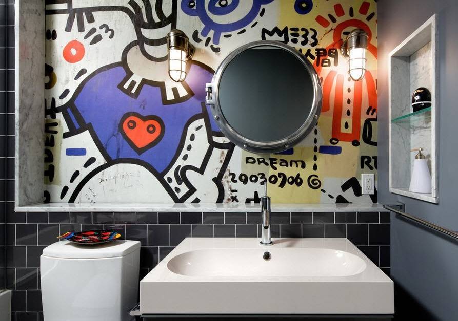 Тематика — обитатели морского дна, подводные лодки, кабинки теплохода, футуристические или сюрреалистические сюжеты. Рисунки могут переплетаться с надписями. С помощью граффити украшают одну или все стены ванной комнаты и даже потолок.