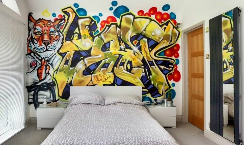 В современном интерьере спален граффити на стенах будто оживают. Такой дизайн будет уместен в комнатах креативных людей, которые стремятся к изучению новых течений и не боятся быть оригинальными. Граффити отлично впишется в дизайн комнаты подростков, увлекающихся спортом.