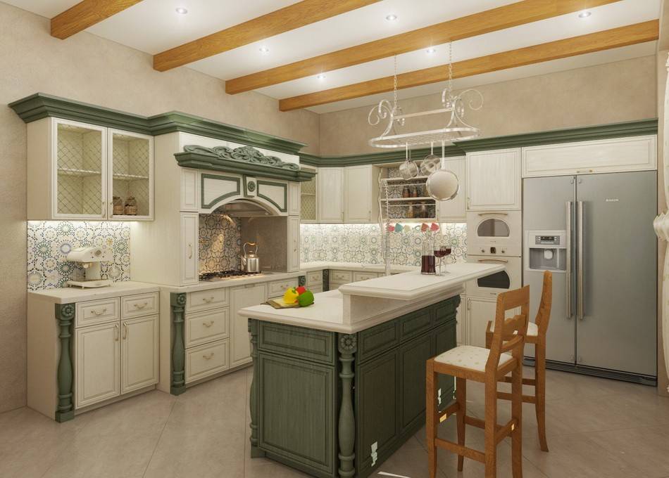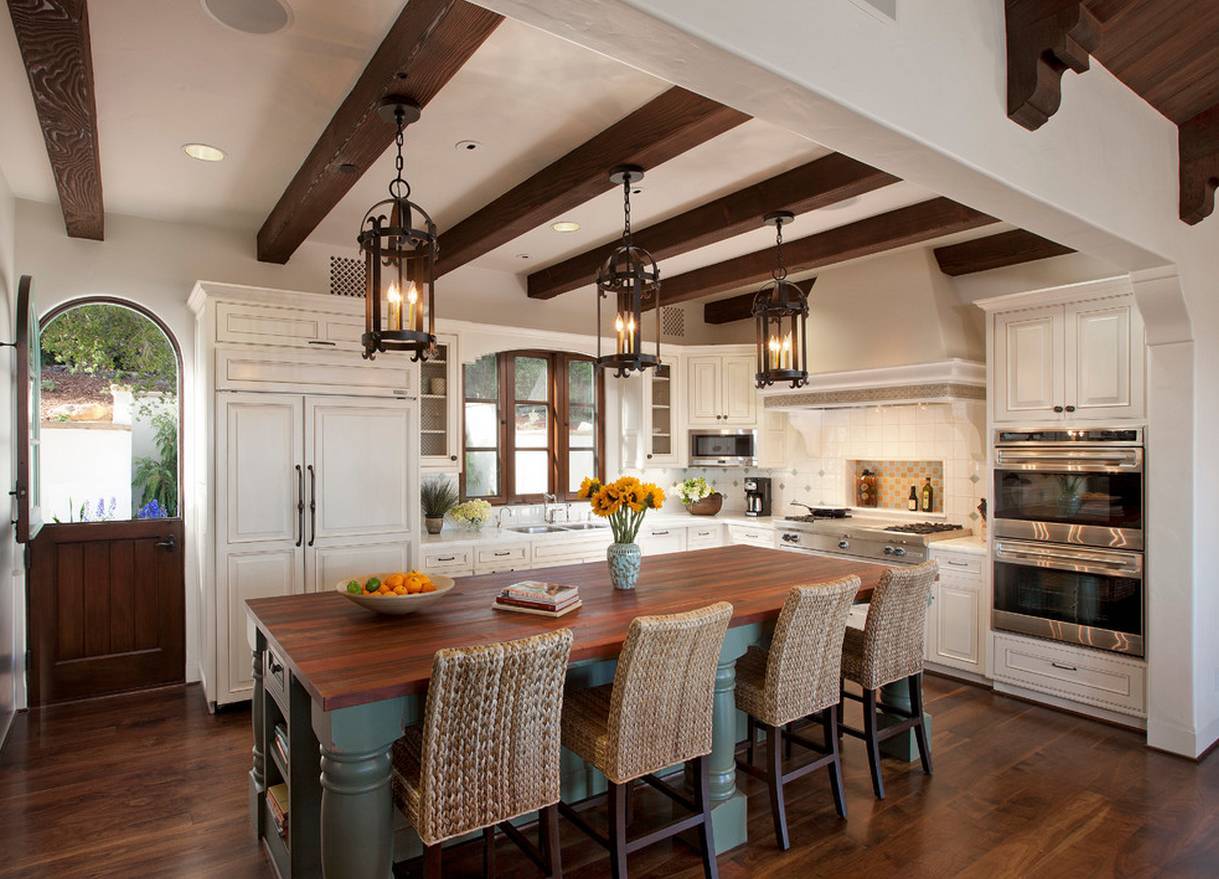 На потолке комнаты могут располагаться массивные деревянные балки. В греческом дизайне они обладают светлым, будто выцветшими на солнце цветом, а в итальянском стиле — тёмно-коричневым. Деревянные балки будут органично смотреться на потолке просторной кухни частного дома. Для квартиры такой вариант не подойдёт, так как балки крадут пространство комнаты, визуально уменьшая её. На фото можно рассмотреть дизайн кухни в средиземноморском стиле с потолочными балками.