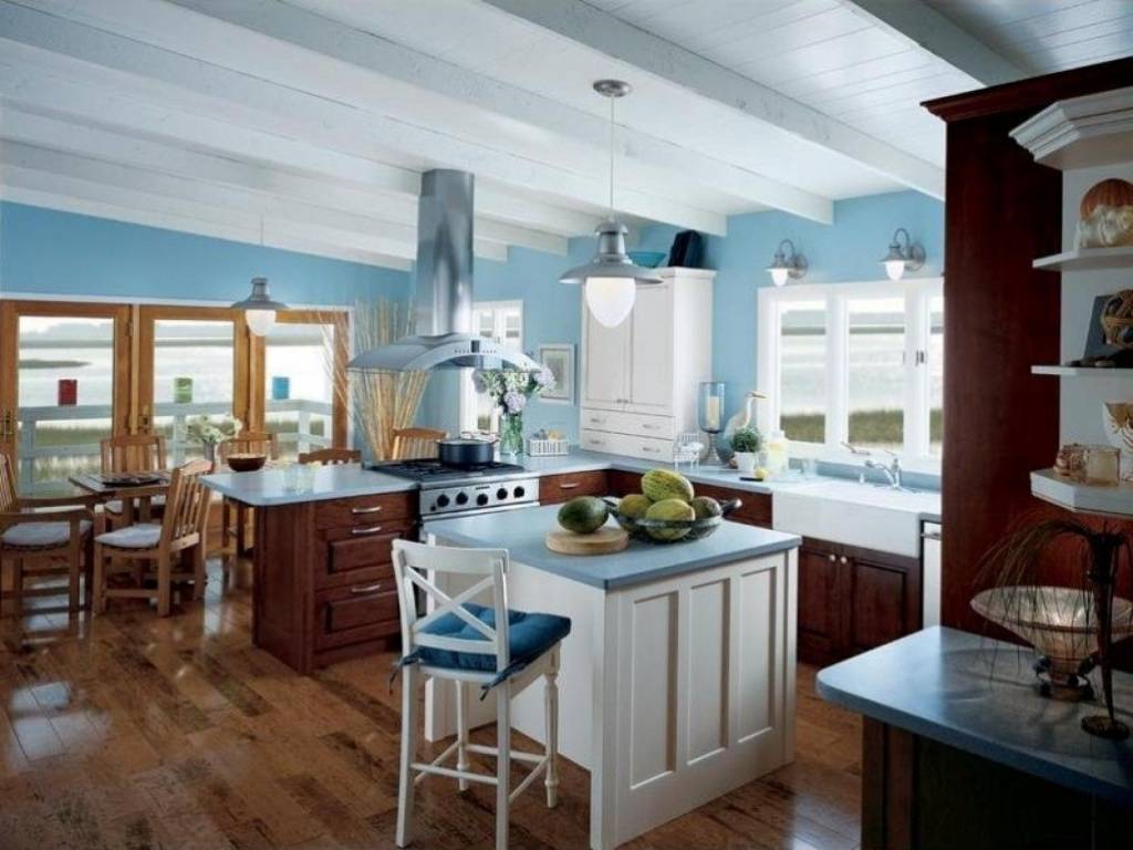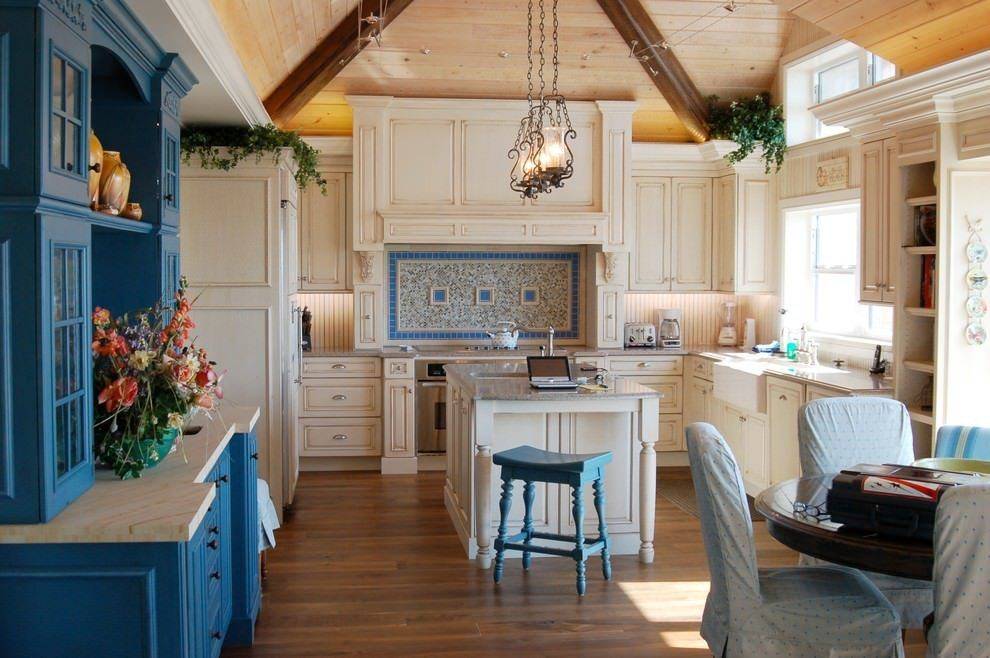 Потолочные балки на кухне в средиземноморском стиле стильно смотрятся в синем цвете