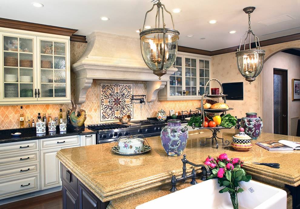 Итальянский стиль предполагает отделку фартука однотонным материалом. При оформлении интерьера в испанском стиле вертикальную поверхность над рабочим столом и короб встроенной вытяжки применяют азулежу — специальную плитку с уникальными узорами. Также на рабочей стенке красиво будет смотреться майоликовая живопись или мозаика из мрамора.