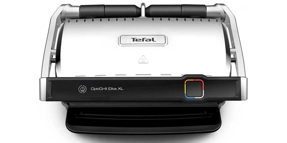 Второе место занимает самая дорогая модель в моём рейтинге — Tefal Optigrill Elite XL GC760D30. Эта модель в корпусе из нержавеющей стали с ручками из термопластика оснащена большими пластинами – 40х20 см, которых хватит для одновременного приготовления 6-8 порций. Панели имеют качественное антипригарное покрытие. Интеллектуальный модуль сам определяет толщину и количество продукта. Исходя из чего выбирает нужный режим готовки – время, температуру. Нужно только указать тип продукта (мясо, рыба, птица, овощи) и назначить желаемую степень прожарки. У модели 16 автоматических программ для приготовления различных продуктов.