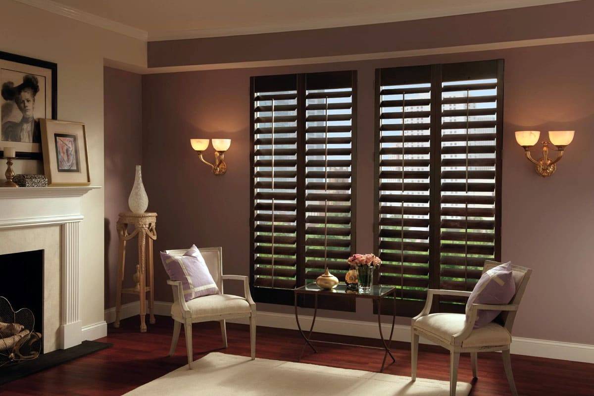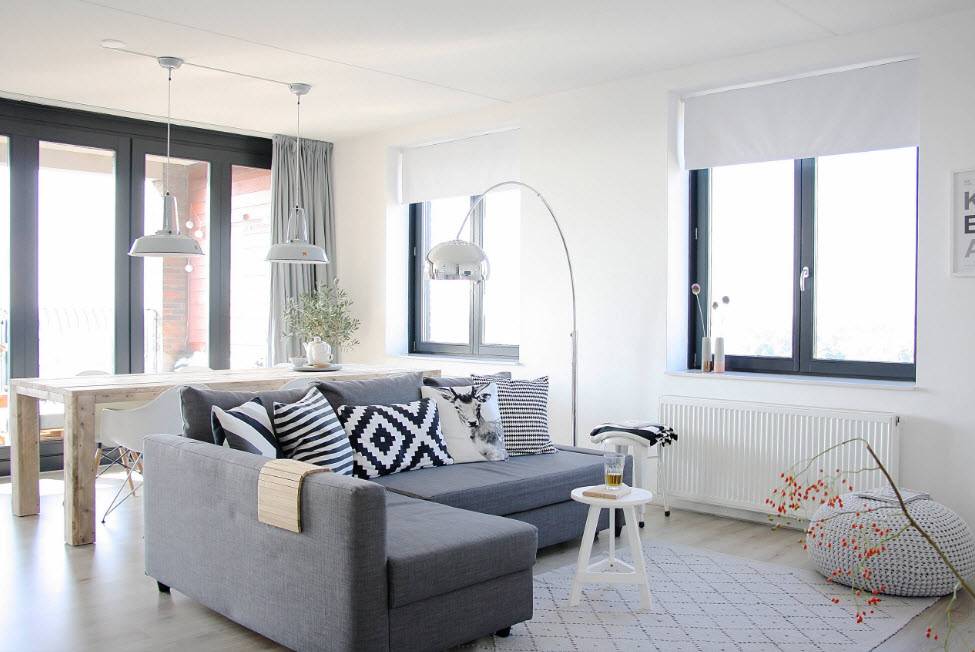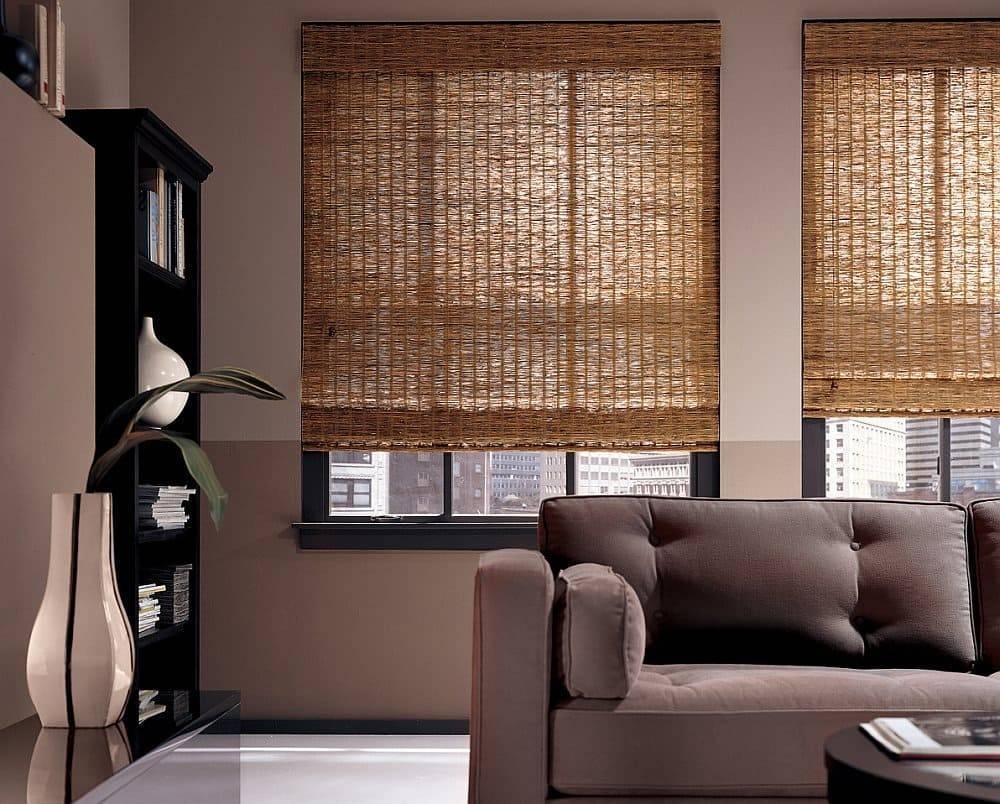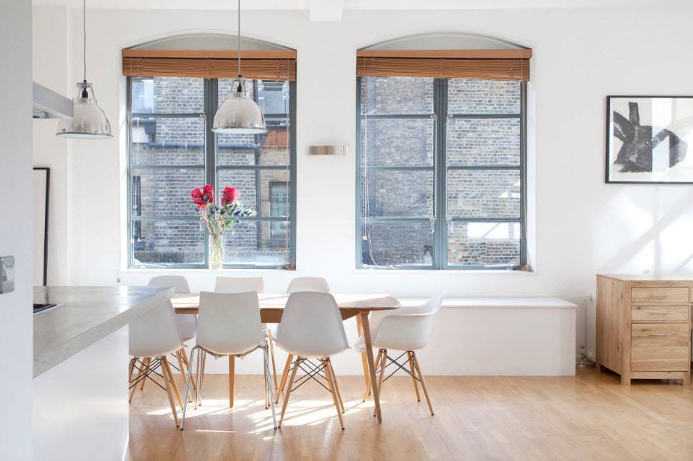Беспроигрышным вариантом при оформлении двух расположенных через простенок проёмов станет использование японских штор. Элегантные и функциональные, они соответствуют главному требованию к декору подобных окон: смотрятся легко, не перегружая стену и помещение в целом.