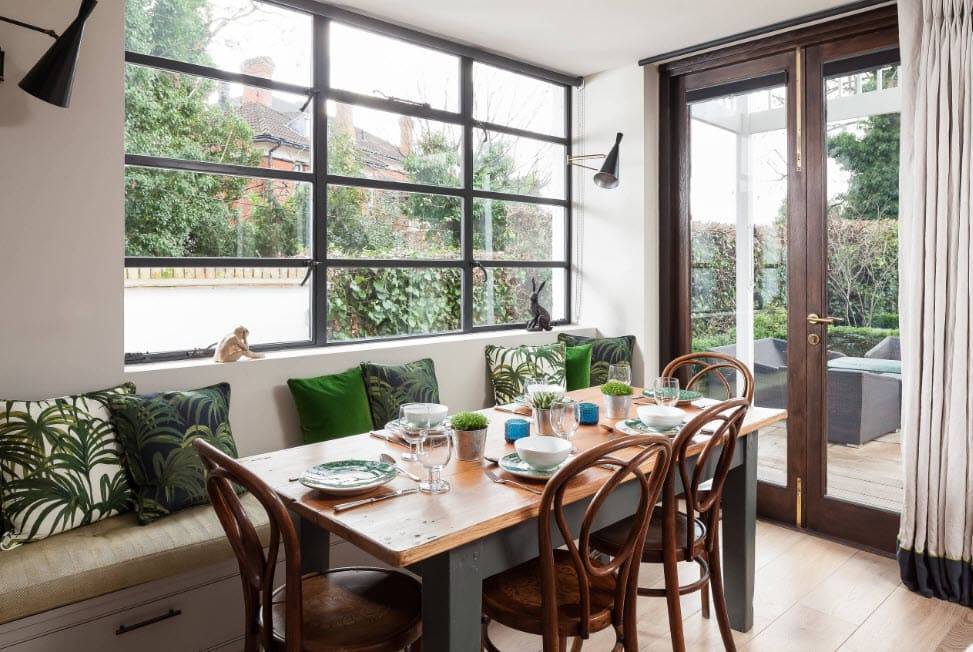 Ложное окно с фотообоями в столовой может выглядеть очень естественноИсточник oz90.ru Для столовой подойдут разные варианты фальш-окна и их комбинации: зеркала и витражи, рисованные и окна с подсветкой, фотообои и имитация с матовым стеклом.