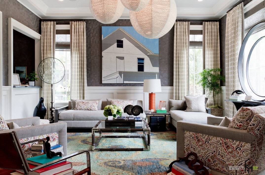 В дизайне комнаты органично использованы традиционные и современные элементы. К первым можно отнести наличие ваз (возможно, привезенных из других стран) на журнальном столике и столешнице шкафа, паркет на полу, картины и рамочный рисунок на стенок с использованием плинтусов. Однако дизайнерская люстра, светильник на стенах и актуальный «состаренный» принт ковра заставляют усомниться в излишней традиционности общего стиля.