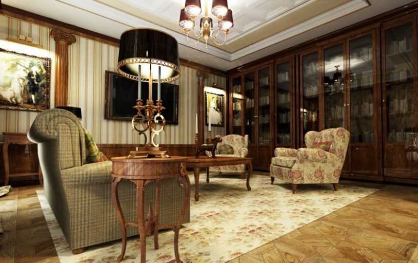 Классика требует естества и традиций – камин и люстру соответственно. Причем последняя должна идти с плафонами. Допускаются подсвечники со свечами, если интерьер английский или колониальный. Но тогда придется отказаться от настольной лампы в пользу канделябра.