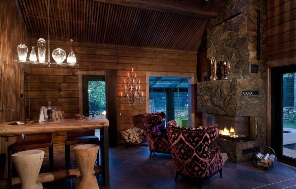 Интерьер в стиле шале можно создать только в дачном интерьере доме с камином и отделкой из бревна и камня. Он должен быть похож на просторное жилище пастуха, поэтому здесь есть анималистичный декор, выступающие козырьки, мансарда из бруса, грубая и плетеная мебель, рукодельный текстиль, глиняная посуда.