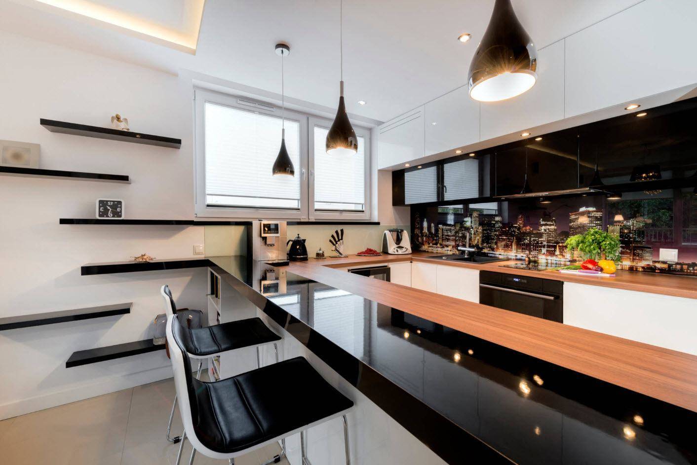 Этот предмет мебели смотрится стильно и современно. Обычно барная стойка встраивается в стену или гарнитур. Она может использоваться для короткой трапезы и посиделок с друзьями. Такое решение актуально для молодых семей.