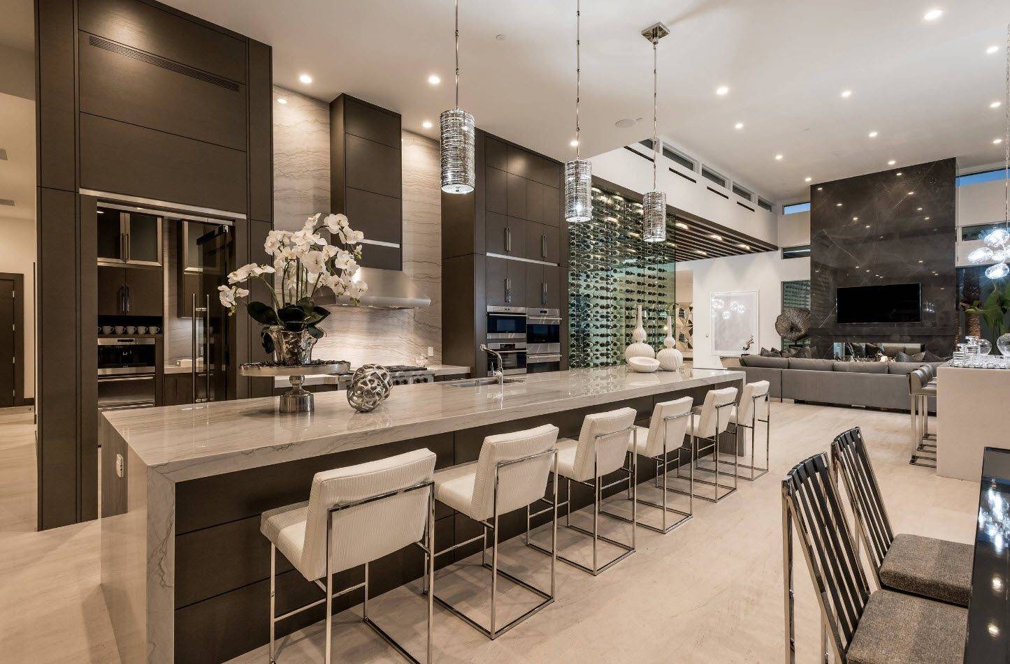 - Удобным вариантом является барная стойка, выполняющая роль обеденной группы. Конечно, в классическом стиле необходимо найти место для полноценной столовой, а в современных направлениях дизайна уместно и такое лаконичное решение.