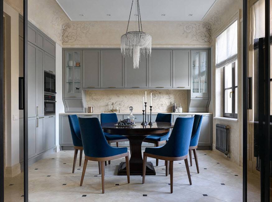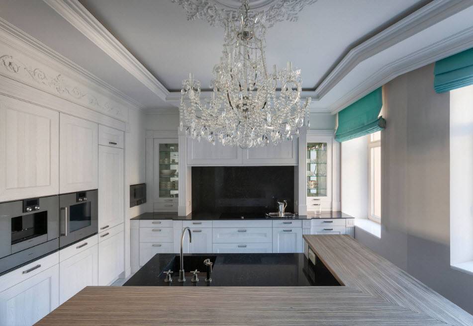 Завершающий штрих в интерьере кухни – изящная хрустальная люстра.