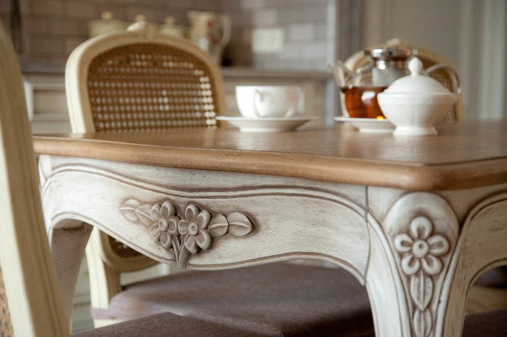Обеденный стол с утонченным резным узором – одно из заметных украшений столовой зоны. Дизайнеры по форме помещения сделали его немного уже стандартных вариантов. В случае приема гостей его всегда можно разложить. Идеальным дополнением служат роскошные стулья на французский манер в точно такой же цветовой палитре.