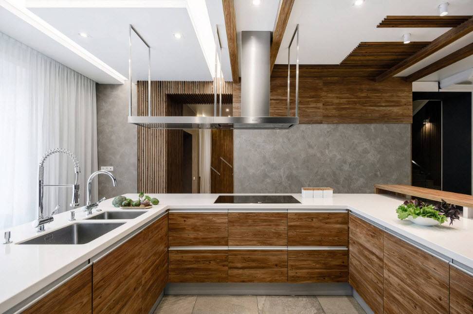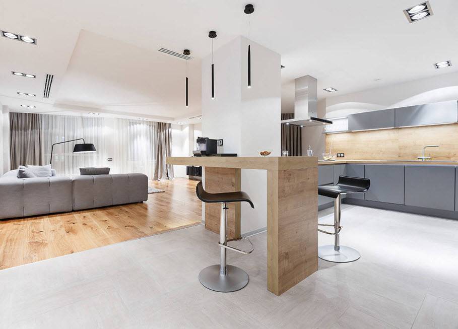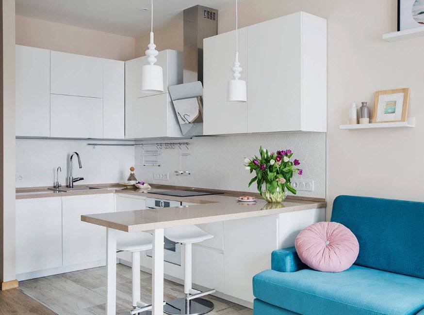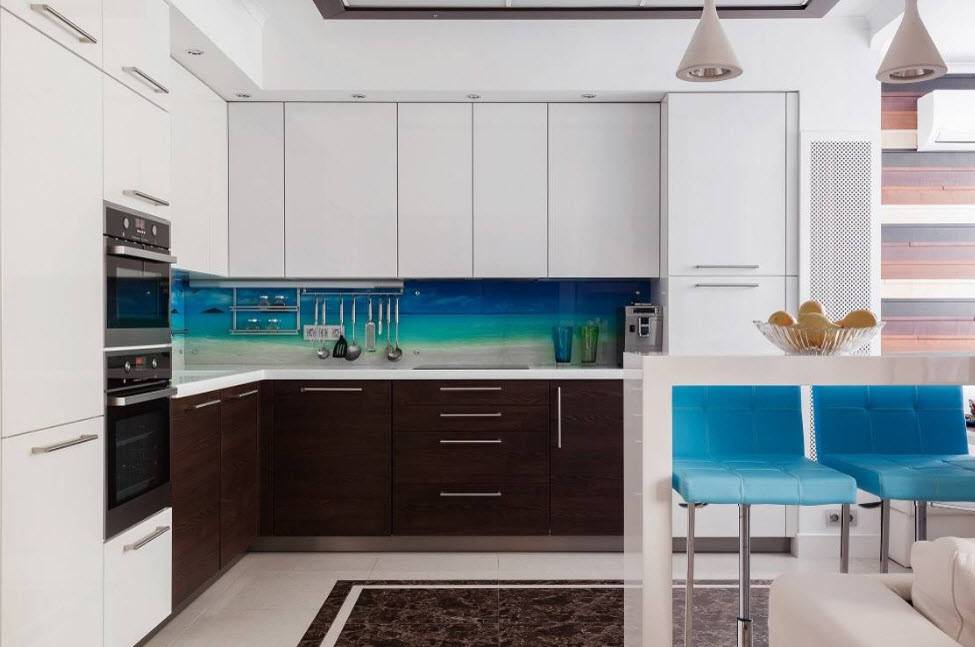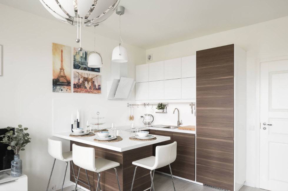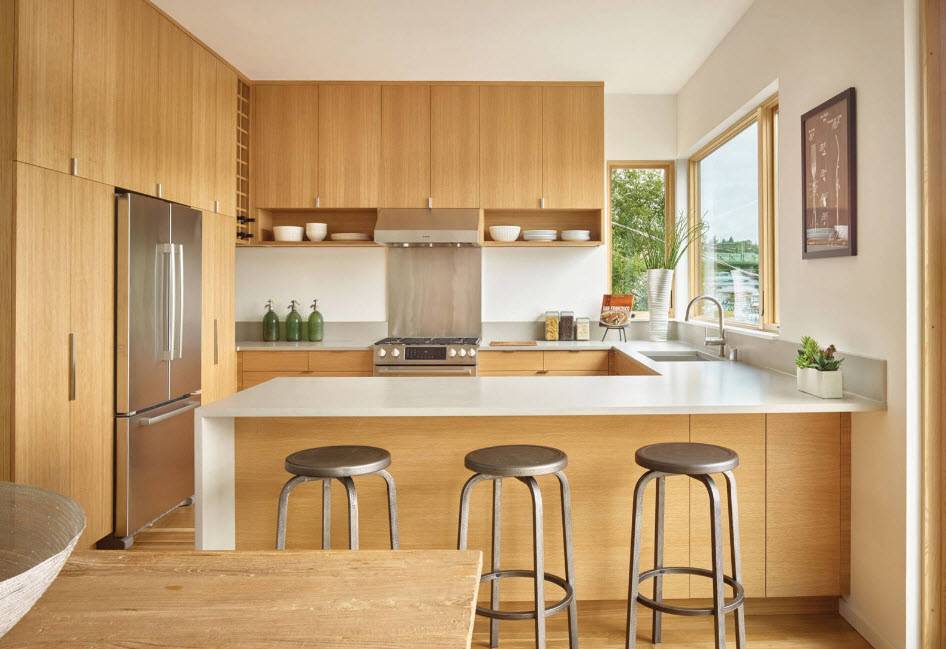 С барной стойкой. Такой гарнитур имеет П-образный вид. Шкафы выстраиваются вдоль стен, или половина может располагаться под окном. Один из торцов совмещают с барной стойкой. Актуальна дополнительная столешница для маленькой кухни, если нет намерения создавать полноценную обеденную зону, отлично заменяет стол. Часто такую планировку можно встретить в квартирах-студиях. Барная стойка здесь может располагаться посередине одной из сторон гарнитура, бывает выдвижной.