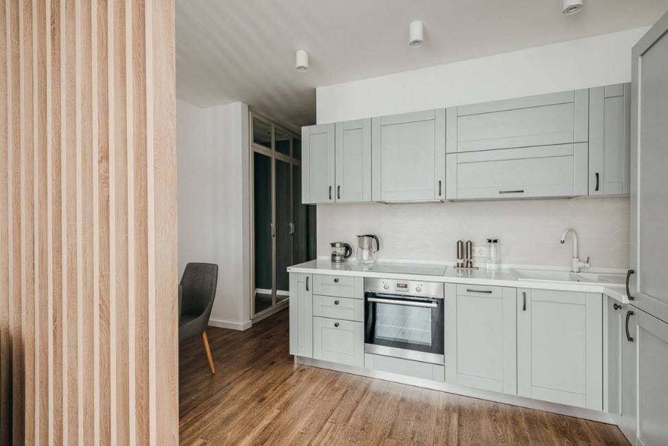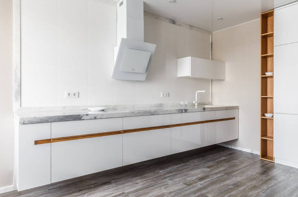С полуостровом. Часть кухонного гарнитура, которая торцом примыкает к основному ряду шкафов, имеет ящики для хранения, столешницу – называется полуостровом. Линейный гарнитур, который дополнен этим элементом, обретает Г-образный вид. Сам полуостров чаще используют как элемент для зонирования, он служит границей между кухонной зоной и столовой, или гостиной.