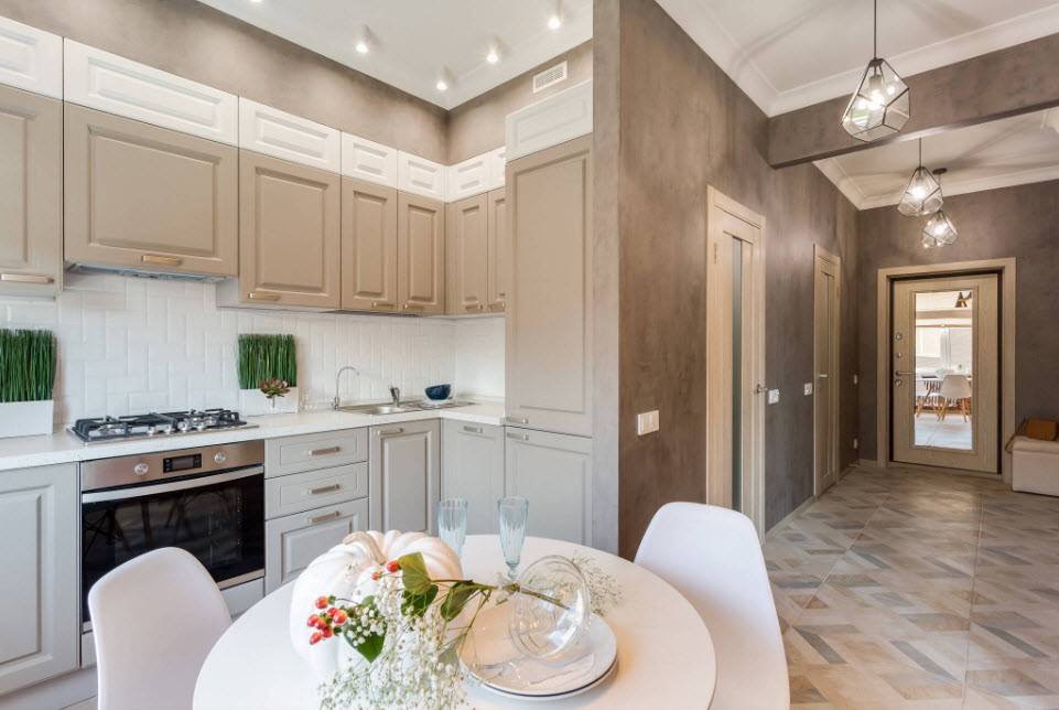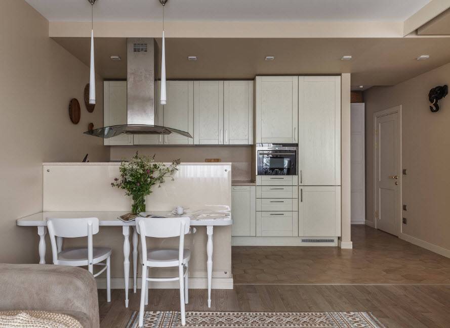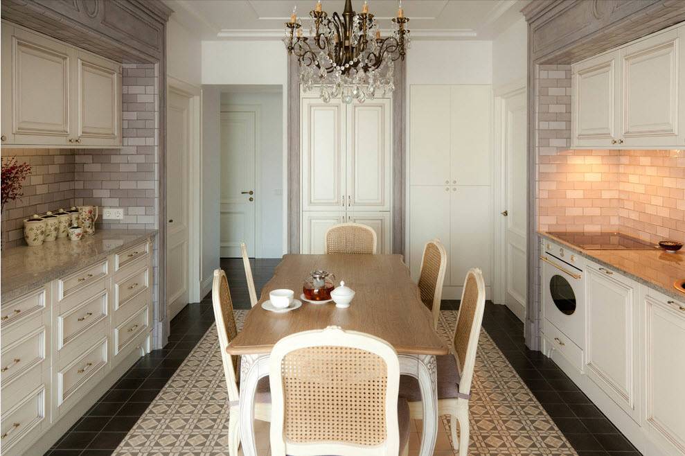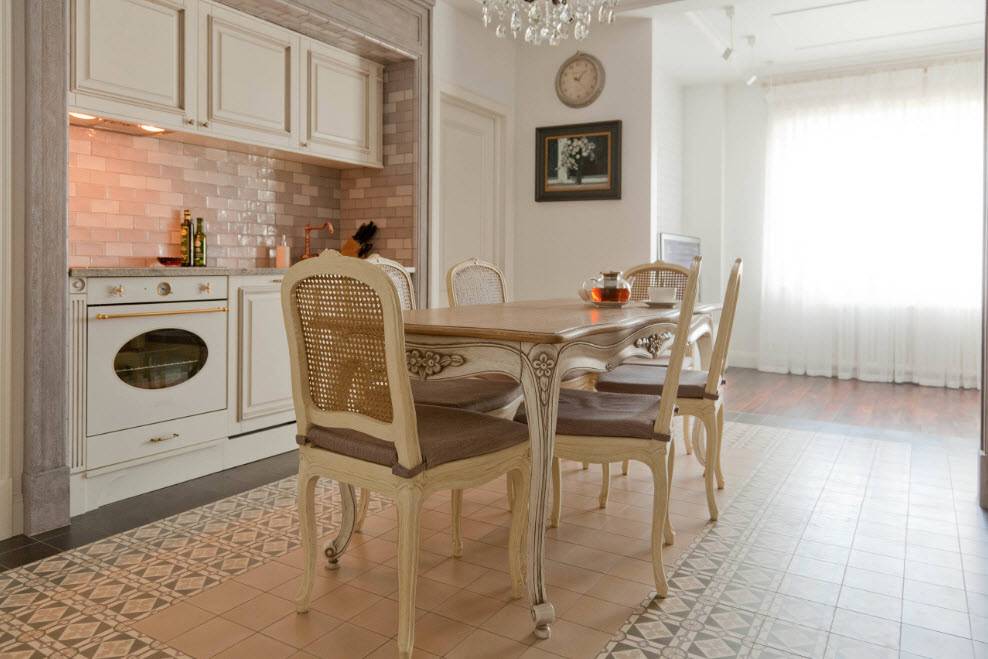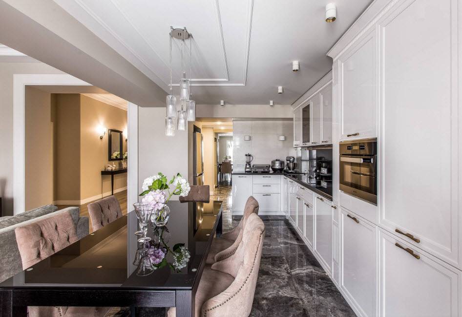 Просторная комната позволяет обратиться к стилю неоклассики. Теплая палитра цветов и утонченная классика на кухне производят впечатление теплого домашнего очага, куда поскорее хочется вернуться.
