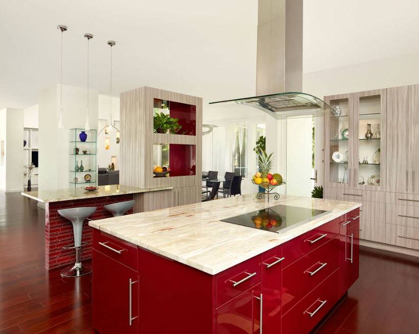 С островом. Такая планировка уместна в просторных кухнях, особенно совмещенных с гостиной. Остров – это отдельно стоящая часть гарнитура с большой прямоугольной или квадратной столешницей. Внутри него есть дополнительные места для хранения. Здесь же можно установить мойку, или варочную панель, или все вместе. Островная конструкция помогает на большой кухне сохранять оптимальную удаленность «вершин» рабочего треугольника. Угловая часть гарнитура размещается либо вдоль глухих стен, либо частично под окном или под двумя окнами.