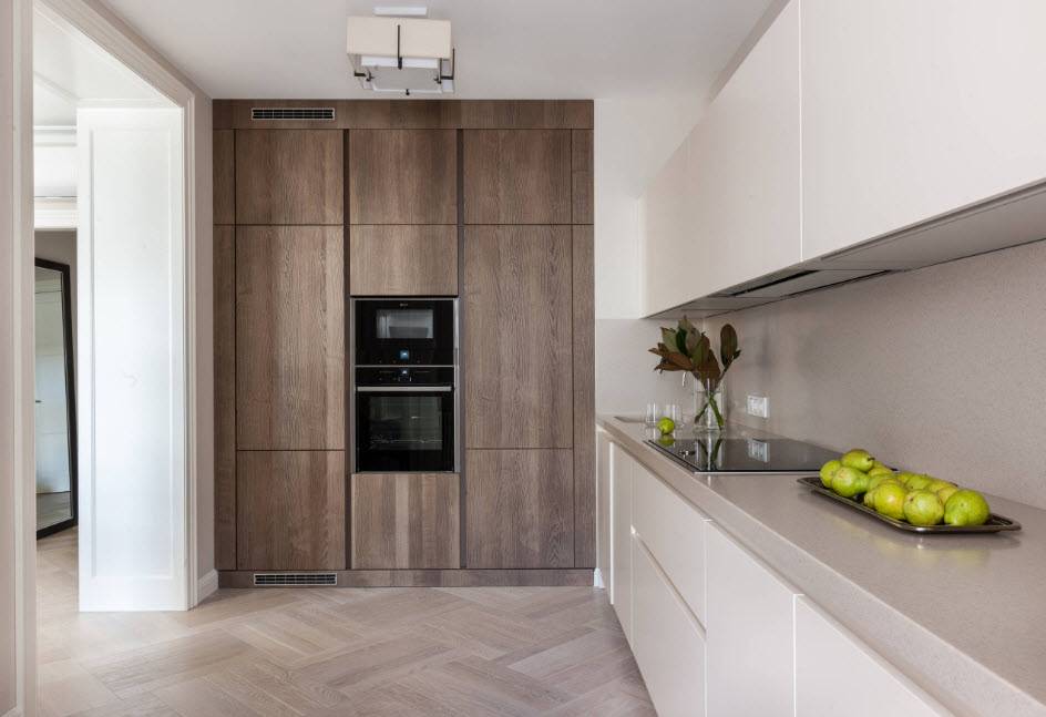 Планировка кухни позволила обустроить комфортные системы хранения. Маленькая ниша закрыта минималистскими фасадами с винными и продуктовыми полочками. В две противоположных линии разместили гранитную столешницу, а в качестве фартука использовали керамическую глянцевую плитку.
