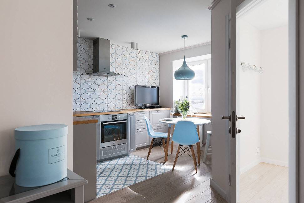Яркие акценты тщательно продуманы дизайнерами. Оригинальные часы с деликатной римской шторой соответствуют цветовой тематике на кухне, а фарфоровые белые тарелки с характерными рисунками подхватывают советский шарм – идеально сочетаются с белой стеной, дополняя дом винтажной атмосферой.