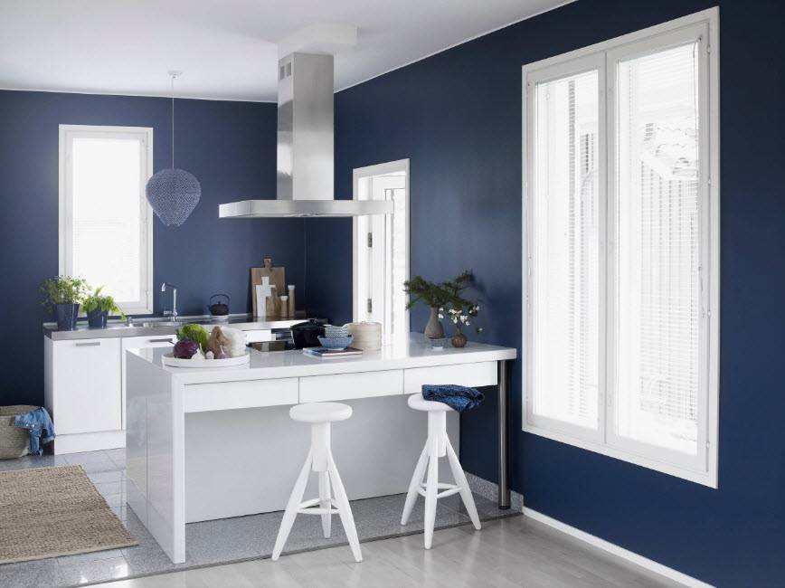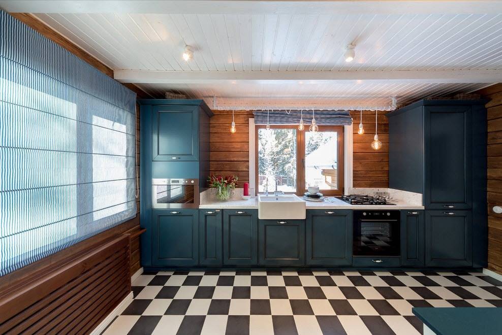 Кухонные фасады в насыщенной синей палитре с патиной, которая отлично комбинирует с белым потолком и древесными ореховыми стенами. Столешница изготовлена из светлого мрамора с темными разводами. На полу черно-белая плитка в шахматной раскладке заметно освежает интерьер, делает его более интересным и динамичным.
