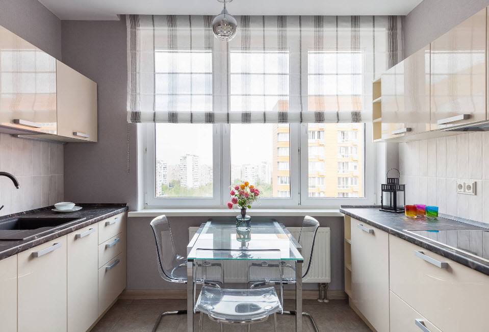 Наверное, чаще всего угловые стекла встречаются именно на кухнях. Получается это либо в результате перепланировки, когда комната лишается полноценного габаритного окна, либо же такой дизайн является задумкой архитектора.