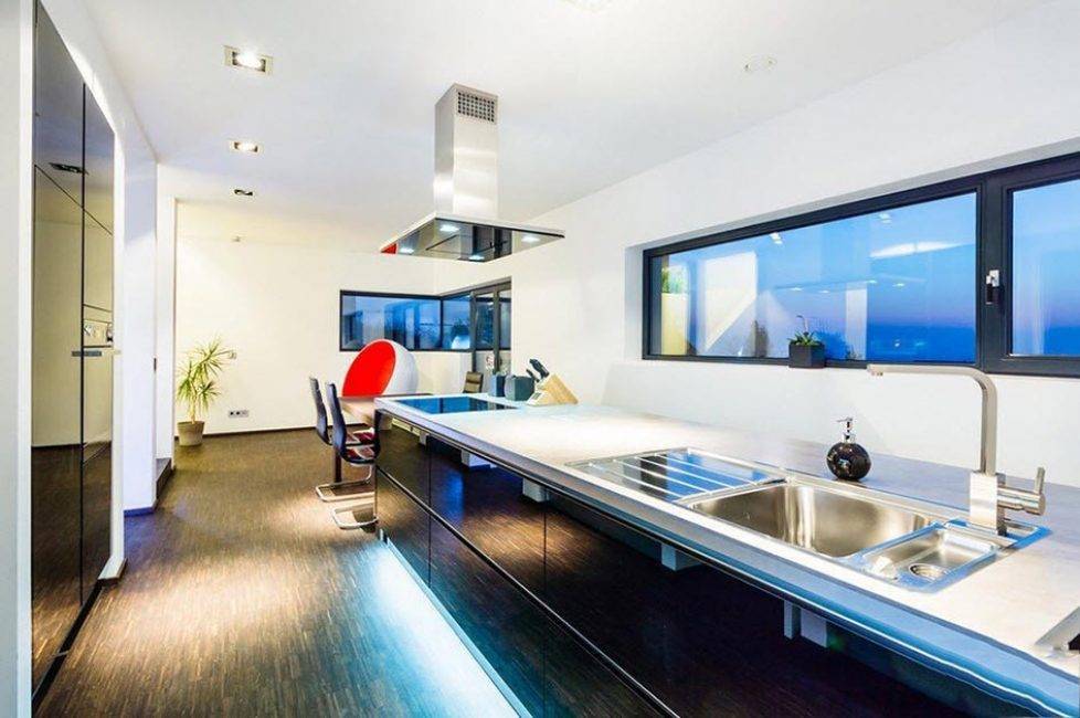 При разработке проекта дизайнеры учли, что в доме много окон. Поэтому прекрасной идеей стало размещение кухонной зоны вдоль одного из них. По бокам симметрично расположены пеналы, посередине – шкафы внизу.