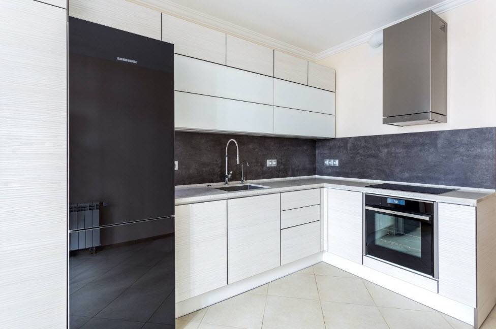 Г-образный гарнитур, установленный вдоль смежных стен. Это стандартный вариант, который встречается наиболее часто в малогабаритных кухнях. Такое расположение оставляет свободным окно, позволяет соблюсти правило рабочего треугольника. На одном из торцов гарнитура, слева или справа, устанавливают холодильник, около смежных стен варочную панель и мойку. В этом случае между «вершинами» треугольника остается допустимое расстояния – около 1,5 метров. Это удобно.
