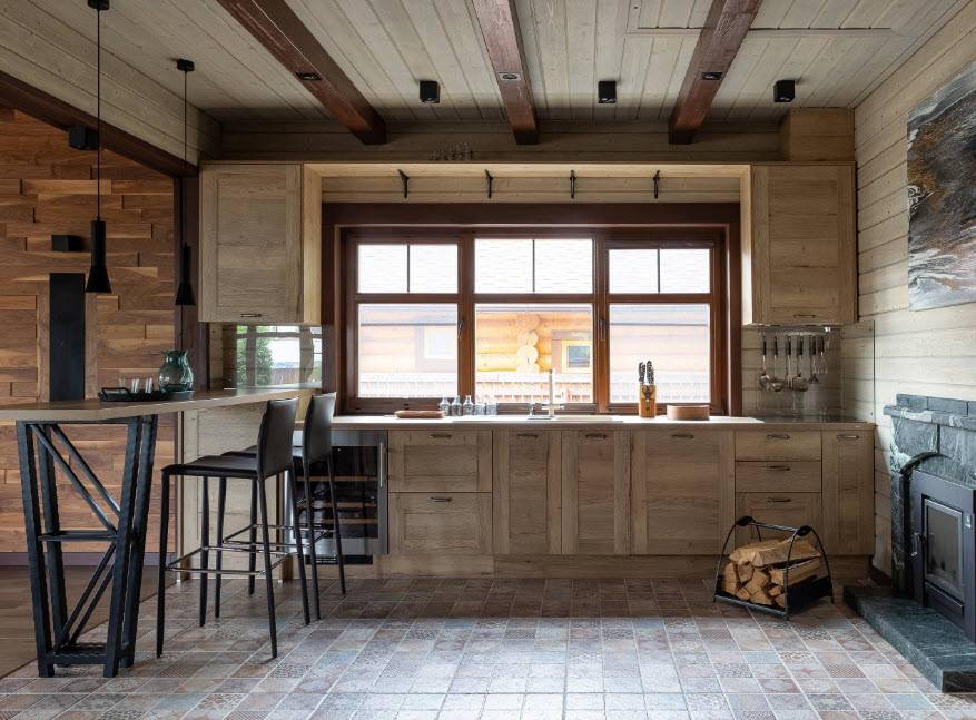 Основополагающими и ключевыми решениями в оформлении этой кухни в старом частном доме стали ретро-детали, деревянные стены, печь-камин и возведенная перегородка из бруса, разделяющая помещение на кухню и гостиную зону.