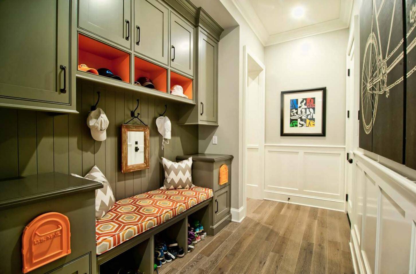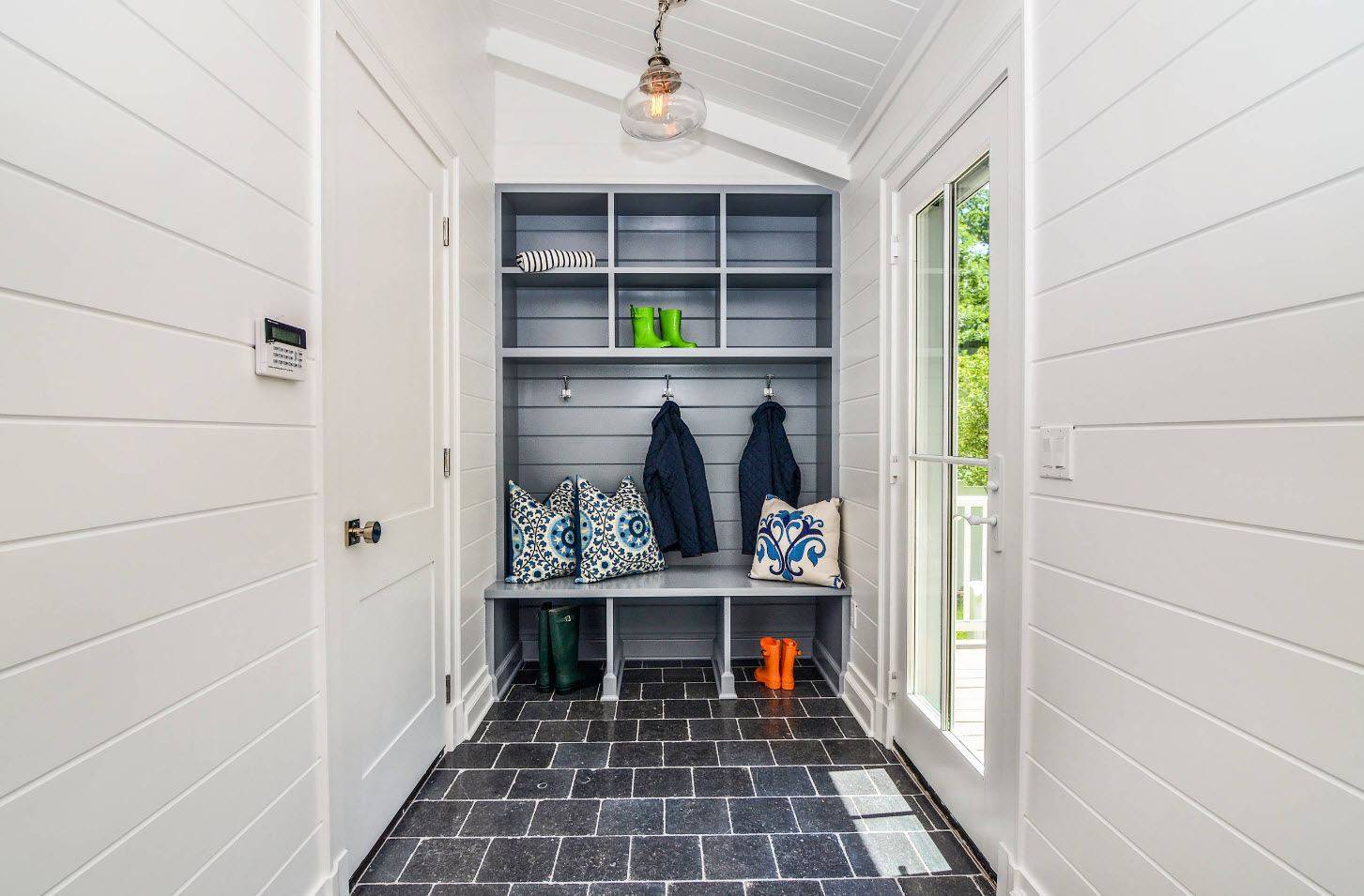 Кроме того, при помощи облицовки можно и разделить пространство. Сделать часть с тамбуром одним цветом обоев или краски, а место для переодевания в другом цвете. В этом же может помочь потолочная часть.