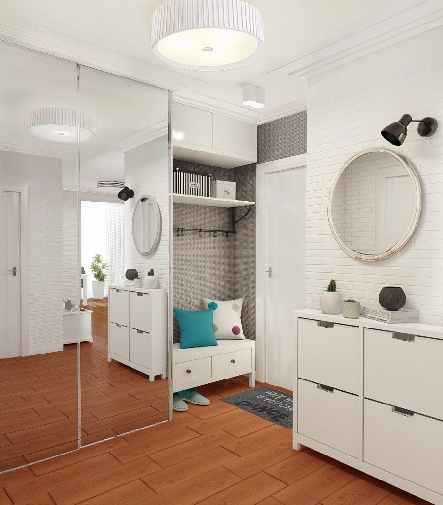 При помощи планировки можно творить чудеса. Чаще всего в хрущевке достаточно длинные, но узкие коридоры. Их разделяют на две части и в одной оборудуют место для переодевания со шкафом-купе и всевозможными вешалками. Вторая часть подразумевает под собой небольшой свободный тамбур, в который попадает человек при входе в квартиру. Там достаточно мягкий свет от ламп, который визуально увеличивает пространство. Отличным вариантом будет оборудовать такой тамбур светлыми обоями.