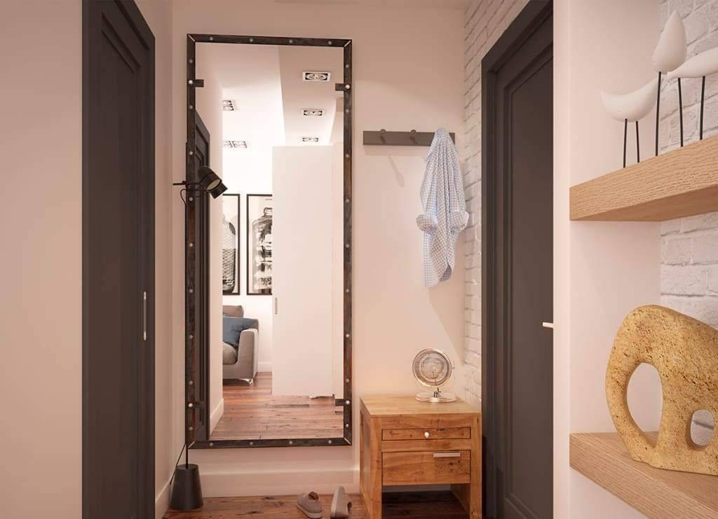 Даже в самой небольшой прихожей зеркало (желательно во весь рост) создаст иллюзию прохода в другое помещение. Это, в свою очередь, зрительно увеличит габариты коридора. Для того, чтобы прихожая смотрелась более стильно, зеркало можно облачить в широкую декоративную раму в тон пола.