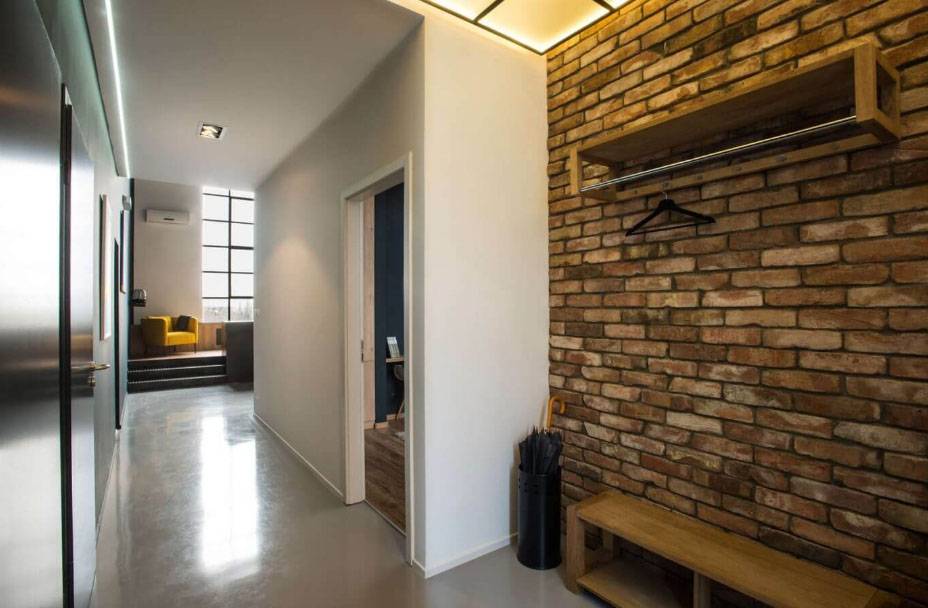 Облицовка в стиле лофт сочетающая бетон, штукатурку, камень, дерево и урбанистические детали, оживляет интерьер коридора в хрущевке и придает обстановке динамичности. В помещении предполагается установка простой пластиковой или деревянной мебели без вычурных декоративных элементов. В маленькую комнату прекрасно впишется комод или полки, дополненные подвесными лампами и светильниками.