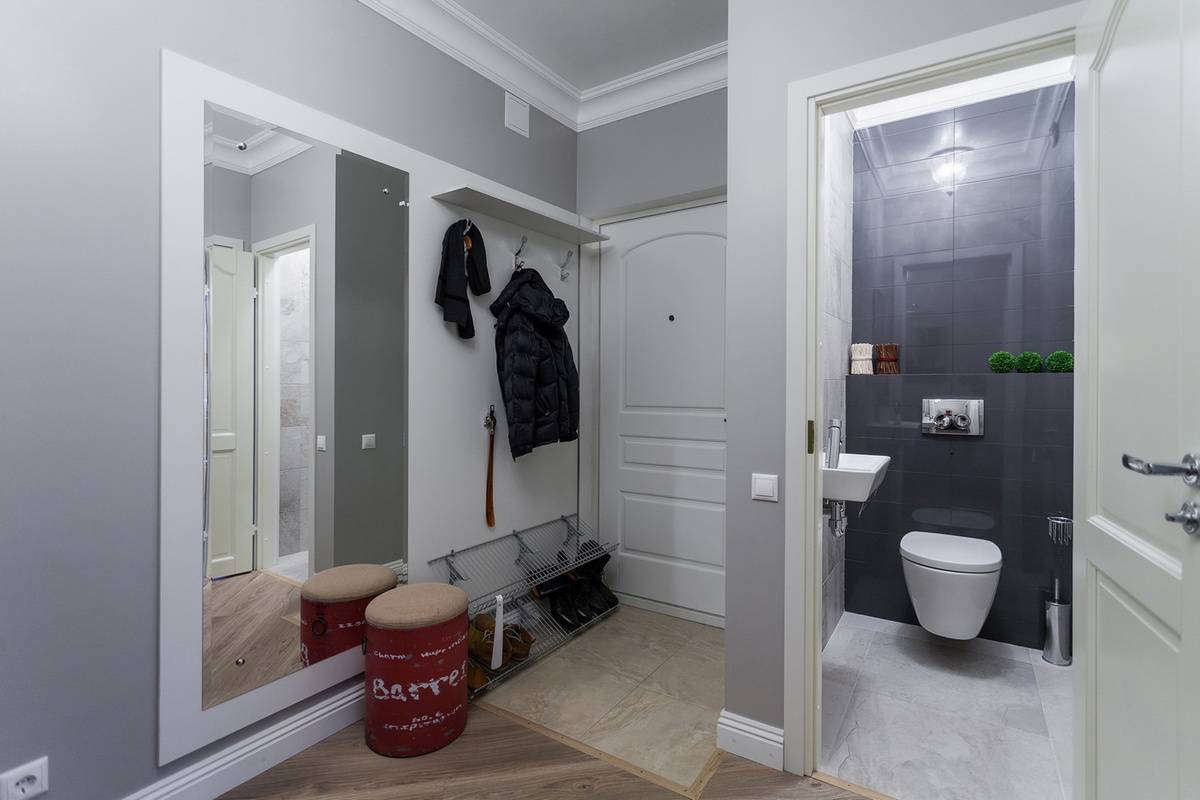 Перед тем как начать ремонт обязательно подготовьте дизайн-проект. Уделите поиску подходящего интерьера несколько дней. Если вы обустраиваете квартиру-студию, где прихожая плавно перетекает в гостиную или кухню, используйте минимально необходимый набор мебели / предметов. Например, крючки на стене и полочку для ключей, можно добавить пуфик или мини-лавочку. Для того чтобы дизайн студии выглядел гармонично, в прихожей должна быть использована та же отделка и цвета.
