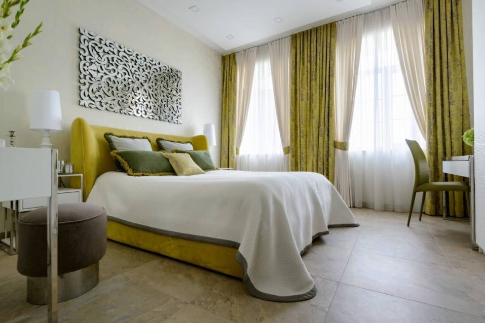 Зелёные шторы и покрывало, способствуют более быстрому обретению расслабленного и умиротворённого состояния. Синие оттенки настраивают на спокойный сон. Бежевые аксессуары наполнят комнату ощущением защищённости и безопасности. Что касается более ярких вариаций, то в этом случае всё зависит от вашего предпочтения и характера общего оформления. Шторы и покрывало для спальни могут быть выполнены в одном дизайне, а могут просто подбираться под весь стиль. В таком случае дизайнеры не советуют одновременно сочетать в спальне более трёх оттенков.