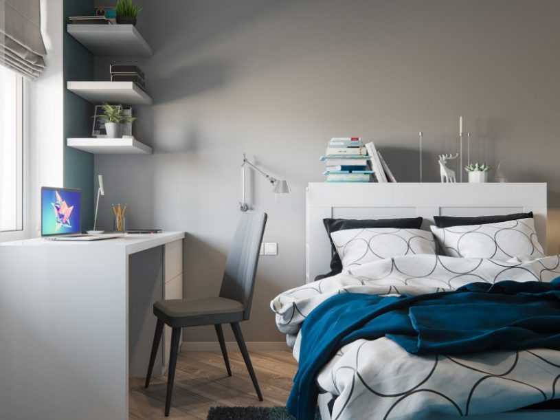 Если дизайн спальни предполагает наличие рабочей зоны или библиотеки, то в такой ситуации следует предусмотреть место для компьютерного стола и книжных напольных или подвесных полок.