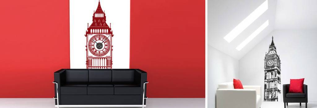 Часовая башня, украшающая здание британского парламента – еще один хорошо узнаваемый символ Лондона. Контрастные по отношению к белым стенам в интерьере наклейки выглядят в эффектно и стильно.