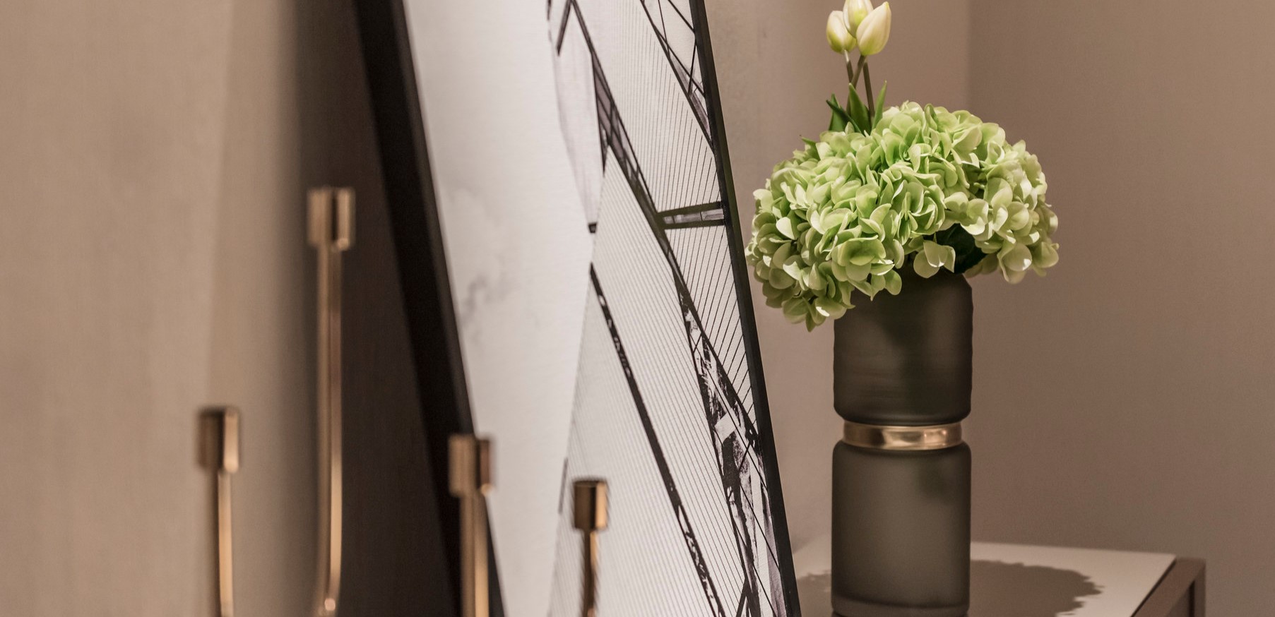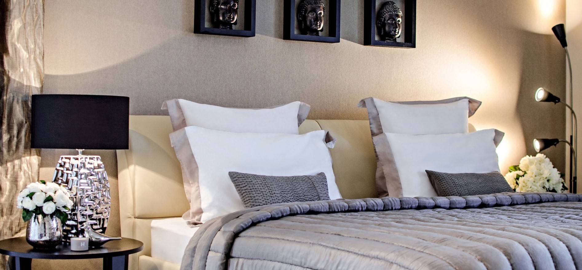Букеты на прикроватных тумбочках идеально дополняют интерьер спальни