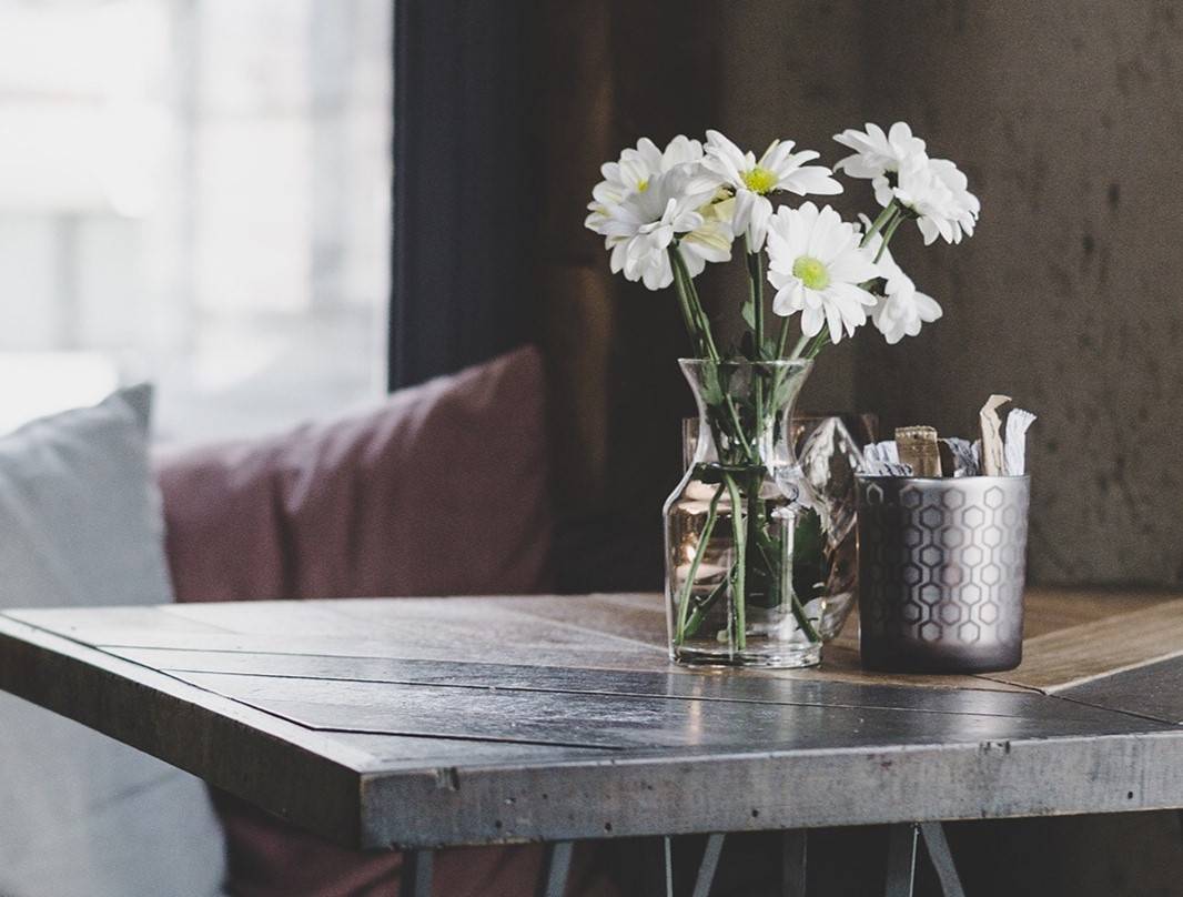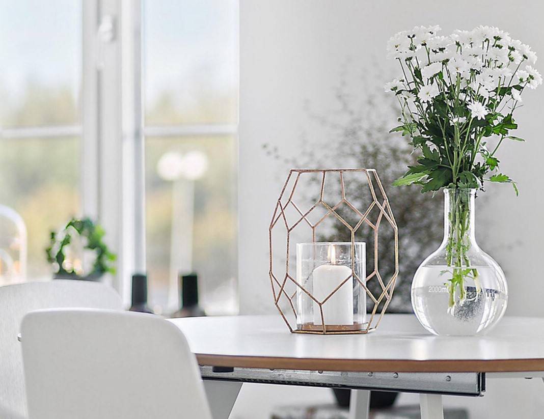 В современном интерьере отлично будут смотреться белые цветы в прозрачной вазе