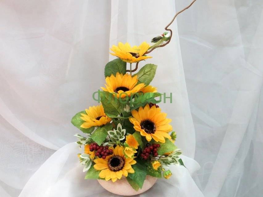 искусственные растения дают возможность самостоятельно подбирать цветовой оттенок букета. Если вам по душе ярко-желтые подсолнухи, но весь интерьер оформлен в сдержанных тонах и классическом ключе, и вы не хотите, чтобы композиция на стене выбивалась из общей стилистики комнаты, выход есть.
