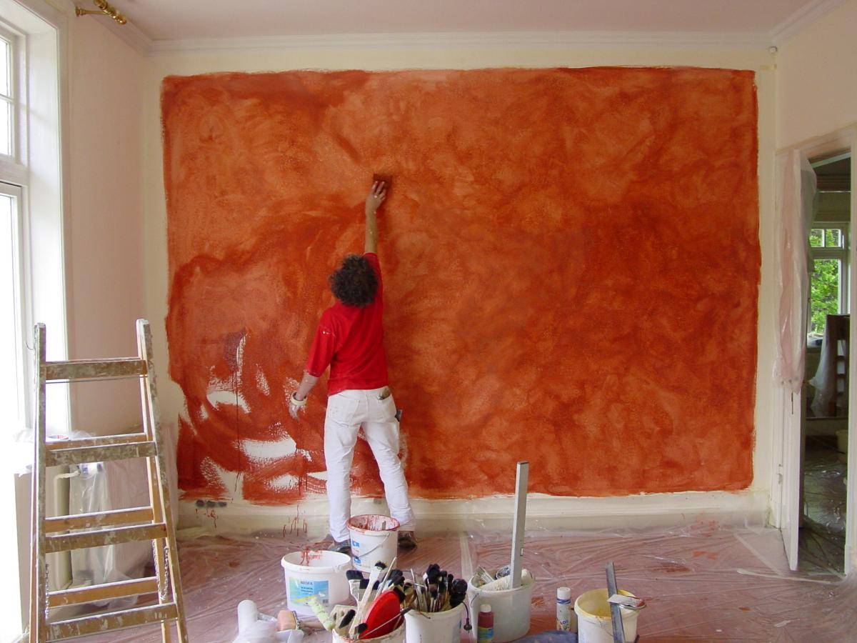 Нанесите на стену первый слой клеевой краски бледного цвета, второй чуть-чуть темнее. Пока второй слой не просох, следует взять обыкновенную тряпочку или губку, и немного его растушевать. Это нужно для создания специального художественного эффекта.