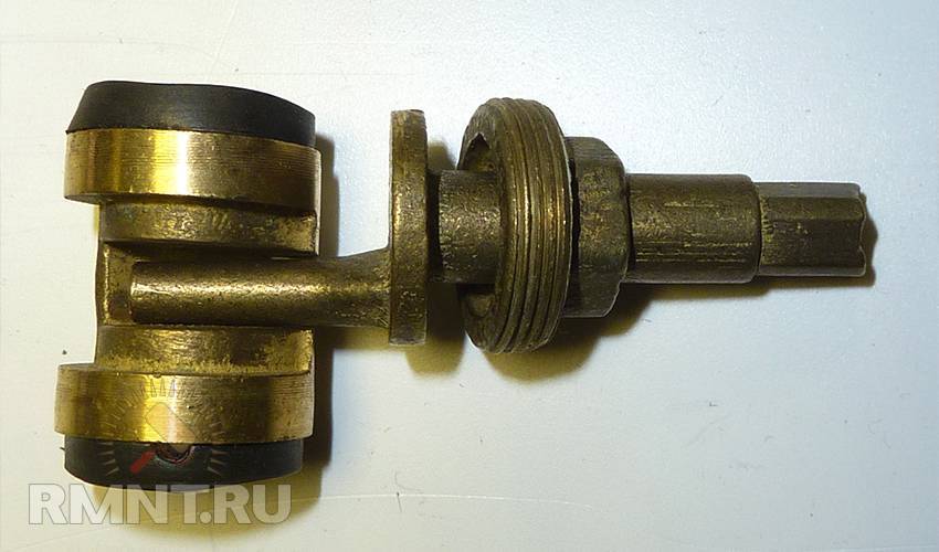 На поворотном штоке есть ограничительный винт, который регулирует угол поворота керамических прокладок. Если его выкрутить, то шток можно вынуть с внутренней стороны корпуса и, при необходимости, заменить резиновую прокладку, из-за износа которой вода может протекать из-под «барашка» при открытом кране. Строительным ножом аккуратно срезается старая прокладка и на ее место устанавливается новая. Затем шток ставится на место и вкручивается ограничительный винт.