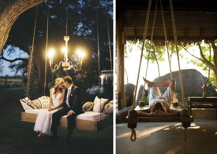 Качели с мягким матрацем и уютными подушками — отличное место для отдыха