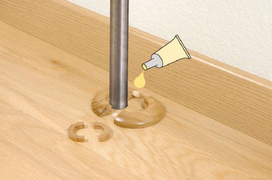 Когда вы сделали одно или два отверстия, вам нужно провести через центр отверстий прямую и уже по ней необходимо отрезать часть доски. Таким образом, устанавливаем ламинат, а сзади труб нужно вставить тот отрезанный кусок. Стык промазать нужно клеем универсальным или же по дереву, он тоже подойдет, клеем мы закрепляем всё окончательно. Зазор необходимо закрыть накладками. Они имеются в различных расцветках. Вы ставите те, которые нужны вам, подойдут любые.