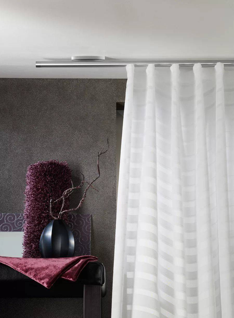Подобный тип часто монтируют к потолку и делают скрытым. Если крепеж остается видимым, то наружную часть украшают блендой – неширокой декоративной планкой. Правильно установленный профиль из алюминия способен выдерживать любые нагрузки. А пластиковые образцы лучше использовать с невесомыми материями.