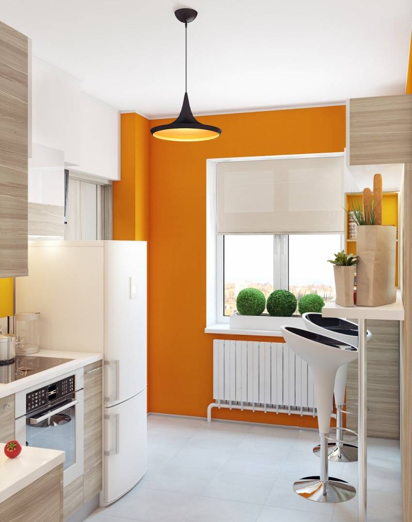 Для оформления окна на кухне без штор, можно одну стену сделать акцентной, которая будет привлекать на себя внимание