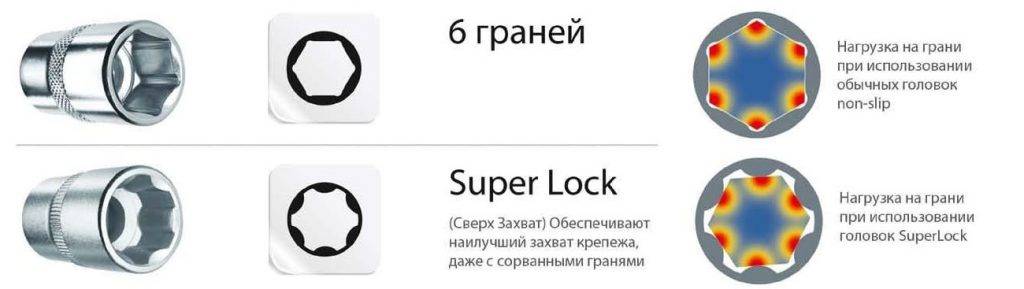 Торцевые головки с профилем Super Lock принципиально отличаются от шестигранных головок по месту захвата крепежа. Если шестигранный профиль головки максимальное усилие прикладывает к углам, то головки Super Lock нагружают грани крепежа.