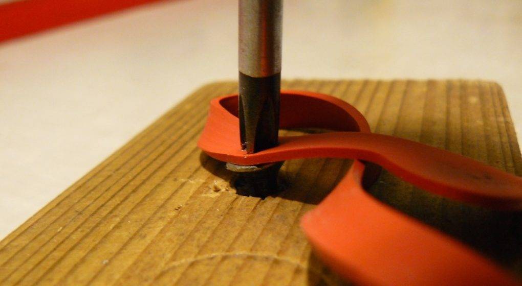 В этом случае используют небольшую часть медицинского жгута или кусочек плотной резины. Выбранный материал укладывают сверху на головку винта или шурупа, после чего надавливают отвёрткой и постепенно его проворачивают. Наличие резины поможет увеличить трение и решить проблему.